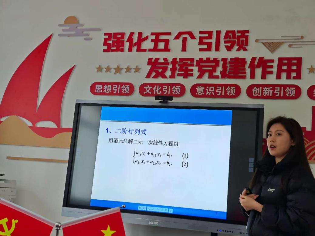 郑毅博士和于爽博士试讲《线性代数》课程内容。通过高中所学内容,逐步引入新知识,有助于员工的理解。