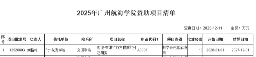 近日,国家自然科学基金委员会公布2025年度数学天元基金项目评审结果。公司刘格格博士申报的《对流–有限扩散方程解的性态研究》天元数学青年项目(批准号:12526603,经费:10万)成功获得立项资助。