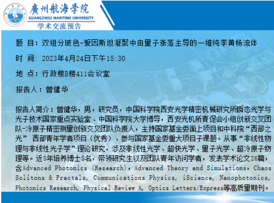 曾健华教授讲座:双组分玻色-爱因斯坦凝聚中由量子涨落主导的一维纯李黄杨流体