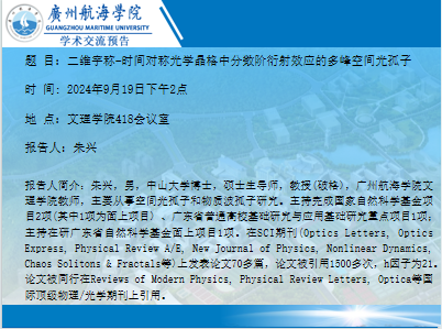 朱兴教授学术讲座预告:《二维宇称-时间对称光学晶格中分数阶衍射效应的多峰空间光孤子》